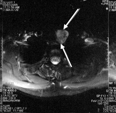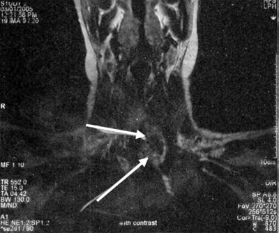 Figures 1 & 2. Transverse and coronal section of MRI scan of the neck showing a 2.5x2.2x3.5 cm heterogeneous mass below the left lobe of the thyroid on the border between the neck and the thorax, extending retrosternally.