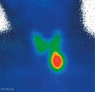 The incidence of thyroid ectopy is unknown. Post-mortem studies suggest that asymptomatic thyroid tissue may be found along the path of the thyroglossal duct in as many as 7-10% of adults.14 Ectopic thyroid tissue may coexist with a eutopic thyroid,5,6,15 as in our patient, or may be the only functioning tissue.1,4,16 In a study of 230 patients with a clinical diagnosis of thyroglossal duct cyst, 4 cases of ectopic thyroid tissue presenting with eutopic thyroid and 3 cases without a eutopic thyroid were described, suggesting that the two may be equal in incidence.17 However, in 70-75% of patients with lingual thyroid there was no eutopic thyroid tissue present in the pretracheal position.18 Patients with a lingual thyroid and no eutopic thyroid commonly become hypothyroid at various times after birth because lingual ectopia is hypofunctioning.3,19