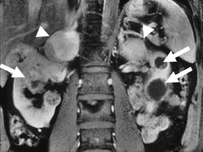 Figure 1. Sagittal MRI section shows bilateral cystic renal cell carcinoma (arrows) and bilateral adrenal pheochromocytoma (arrow heads) in a patient with von Hippel-Lindau disease.