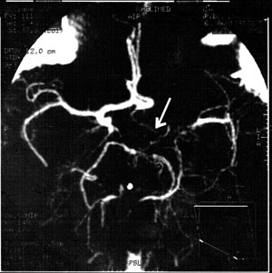 Moyamoya disease manifests itself with complex neurological symptoms resulting from transient ischemic attacks2. The diagnosis of this disease in our short-statured patient was surprising, considering the fact that so far only a few cases of coexistence of endocrinopathy and moyamoya disease have been reported4-7. Mootha et al described two children with GH deficiency, in whom neurological symptoms predominated4. Upon admission, migraine headaches were the only symptoms that could suggest neurological disorder in our patient. Initially, however, they were connected with dysfunction of the temporomandibular joint. The poor results of orthodontic treatment as well as the symptoms of fatigability and yawning led us to associate these signs with possible periodic mild ischemia of the brain. Focal signs with visual and sensory disturbances have been described as migraine in the course of moyamoya disease9. However, in our patient we cannot rule out a complex character of headaches, since dysfunction of facial joints may aggravate them. So far our patient's IQ has been within the normal range without a tendency to decrease. This fact seems to be crucial since mental deterioration is considered to be an indicator of progression of the disease and a possible indication for surgical intervention10.