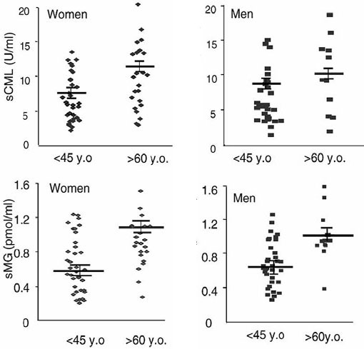 Figure 1. Levels of serum AGEs, εN-carboxymethyl-lysine (sCML) and methylglyoxal (sMG) derivatives are elevated in older men and women. Fasting blood was obtained in older (60-80yrs old) and younger (18-45yrs old) healthy participants for measurement of CML and MG derivatives by ELISA. Data are presented as mean±SEM (*p<0.05).49