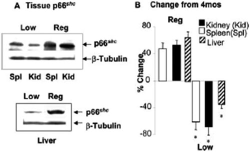 Figure 2. Levels of p66shc protein in kidney, spleen and liver tissues in mice under Low-AGE and Reg-AGE diet. Western blot (A) and densitometry data (B) also indicate the relative change from 4 months of age (baseline). Data shown are mean±SEM of three independent experiments (*p<0.01).30