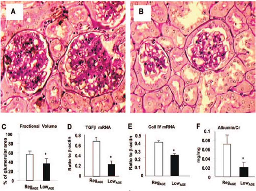 Figure 3. Changes in glomeruli and renal function in mice. A. Morphology of renal cortex on Reg-AGE, B. Low-AGE, C. fractional mesangial volume (*p<0.05), D. Transforming Growth Factor-β (TGF-β) (*p<0.05), E. collagen type IV (Coll iv ) mRNA levels on Reg-AGE versus Low-AGE (*p<0.05) and F. Albumin/creatinine ratio (*p<0.05). Data are shown as mean±SEM of triplicate vaues (original magnificationsx20).30
