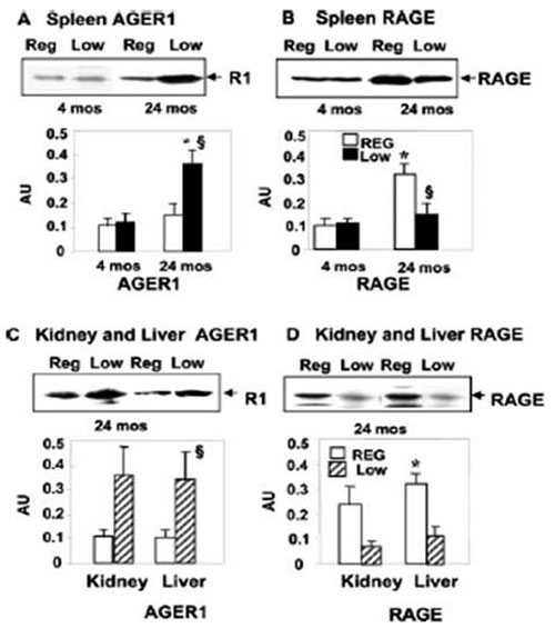 Figure 4. Levels of AGER1 (A) and RAGE (B) protein levels in spleen tissues from Reg-AGE and Low-AGE mice at 4mos (Base line) and at 24mos. AGER1 expression (C) in kidney and liver and RAGE expression (D) in kidney and liver of the same mice groups were also assessed at 24 months by Western Blotting and densitometric analysis (AU). Data are shown as mean±SEM *p<0.01 vs 4month Reg-AGE and § p<0.01 vs 24-month Reg-AGE.30