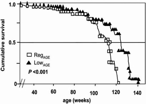 Figure 5. Kaplan-Meier survival curves in Reg-AGE mice (open squares) and Low-AGE mice (filled triangles). Lifespan of the Low-AGE group was significantly longer than the one of the Reg-AGE (p<0.001). Differences between the curves were estimated by the long rank test.30