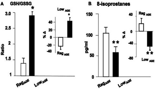 Figure 6. Changes in OS indicators. A:GSH/GSSG ratio. Levels of GSH and GSSG measured in whole blood at 4 (baseline) and 24 months of age. Reg-AGE versus Low-AGE mice *p<0.001). The relative change from baseline is shown in the inset. B: plasma levels of 8- isoprostane are shown as mean±SEM pg/ml. Reg-AGE versus Low-AGE **p<0.01. The relative change from baseline is shown in the inset.30