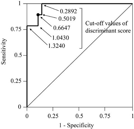 Data were not distributed normally, except the discriminant score. Data were analyzed using Mann-Whitney U-test, Wilcoxon test, Kruscal-Wallis test, the chi-squared test, Fisher's exact test, receiver-operating characteristics (ROC) curve analysis, multiple logistic regression analysis, or discriminant analysis as appropriate. The discriminant score were compared by analysis of variance (ANOVA) and then Fisher's protected least significant difference (PLSD) test. p values less than 0.05 were considered to indicate significance. Results are presented as the mean±SEM unless otherwise stated.