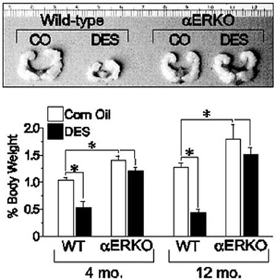 Figure 1. Effect of neonatal DES exposure on seminal vesicle weight in adult WT and αERKO mice. Top, seminal vesicles from 6-month old WT and αERKO mice following neonatal exposure to either vehicle (corn oil, CO) or DES (scale is in centimeters). Bottom, quantitative analysis of seminal vesicle weights from WT and αERKO mice at 4 and 12 months of age following neonatal exposure to CO or DES. *, P<0.05. (Modified from Prins, G.S., Birch, L.,Couse, J.F., Choi, I., Katzenellenbogen, B., and Korach, K.S., 2001 Cancer Res., 61: 6089-6097.)