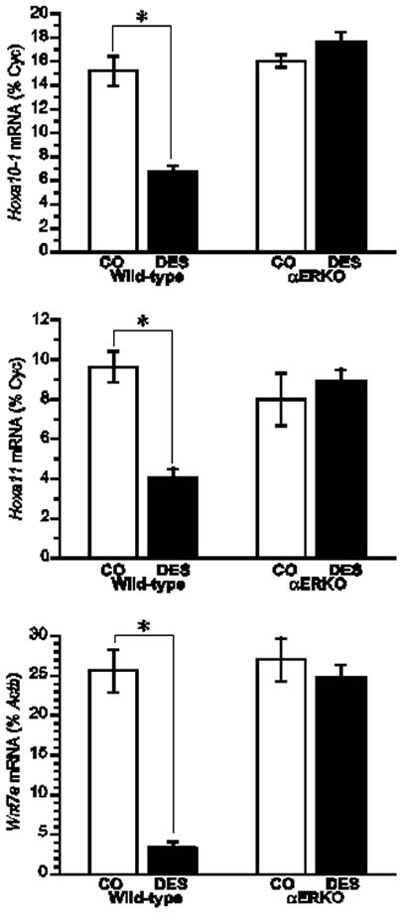 Figure 2. Effect of neonatal DES exposure on uterine expression of Hoxa10, Hoxa11, and Wnt7a in WT and αERKO mice. Top and middle, Quantitative analyses of ribonuclease protection assays (Hoxa10 and Hoxa11) (+/- SEM) showing average percentage of cyclophilin (normalization mRNA) for each treatment group. Bottom, Quantitative analysis of semiquantitative RT-PCR showing the average Wnt7a levels as a percentage of Actb (+/- SEM) for each treatment group. *, P<0.01. (Modified from Couse, J.F., Dixon, D., Yates, M., Moore, A.B., Ma, L., Maas, R., and Korach, K.S., 2001 Dev. Biol., 238: 224- 238.).