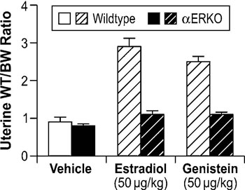 Figure 3. Role of ERα in modulating genistein-induced uterotropic effects. Ovariectomized WT and αERKO mice (n=4 mice/treatment group) were treated daily with subcutaneous injections of corn oil (vehicle), 10µg/kg estradiol, or 50µg/kg genistein for three days. On the fourth day whole body weights were measured and uteri were collected and weighed. The data represent uterine wet weight with respect to whole body weight. (Unpublished data from Lindzey, J. and Korach, K.S.).