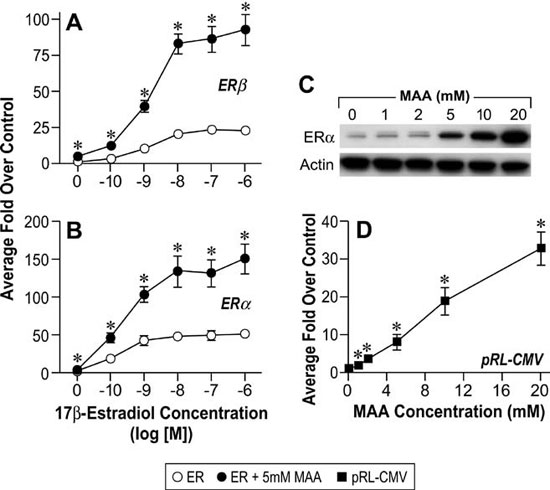 Figure 4. MAA activates the Cytomegalovirus CMV) promoter in vitro. A. HeLa cells were transiently transfected with a human ERβ expression vector, the estrogen-responsive 3X-ERE-TATA-Luc reporter plasmid, and the CMV-β-gal reporter plasmid and treated for 18h with either vehicle, increasing concentrations of E2, 5mM MAA, or increasing concentrations of E2 plus 5mM MAA. The histogram represents the average fold over control of duplicate samples from three independent experiments. The error bars represent the standard error of the mean (SEM), *p<0.05 comparing identical treatments +/- 5mM MAA. B. HeLa cells were transiently transfected with a human ERα expression vector, 3X-ERE-TATALuc and CMV-β-gal and treated identically to the cells in Figure 1A. The data shown represent the average fold over control of duplicate samples from three independent experiments and the error bars indicated the SEM, *p<0.05 comparing identical treatments +/- 5mM MAA. C. HeLa cells were transiently transfected with a human ERα expression vector and treated with either vehicle or increasing concentrations of MAA for 18h. Total protein was isolated from the cells and ERα protein expression was analyzed by Western blot. The data shown are representative of three independent experiments. D. HeLa cells were transiently transfected with the pRL-CMV reporter plasmid and treated with either vehicle or increasing concentrations of MAA for 18h. The data shown represent the average fold over control of duplicate samples from three independent experiments. The error bars represent the SEM, *p<0.01 comparing treatment with MAA to vehicle control. (Modified from Henley, D.V., Mueller, S., and Korach, K.S. In Press Environ Health Persp.).