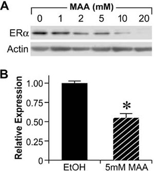 Figure 5. Methoxyacetic Acid (MAA) decreases endogenous ERα expression. A. MCF-7 cells were treated for 24h with either vehicle (EtOH, Ethanol) or increasing concentrations of MAA. Total protein was isolated from each sample and analyzed for ERα protein expression by Western blot. The data shown are representative of results from three independent experiments. B. MCF-7 cells were treated for 24h with either vehicle or 5mM MAA. Total RNA was isolated from each sample and steady state mRNA levels of ERα were measured by real-time PCR. The data shown represent the average fold over control obtained from duplicate samples in four independent experiments, and the error bars indicate the SEM, *p<0.01 comparing treatment with 5mM MAA to vehicle control. (Modified from Henley, D.V., Mueller, S., and Korach, K.S. In Press Environ Health Persp.).