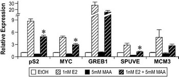 Subsequent to these studies, gene expression experiments were performed to determine if the observed decrease in ERα expression correlated with alterations in estrogen signaling. In MCF-7 cells, pre-treatment with 5mM MAA followed by 1nM estradiol attenuated the expression of the estrogen-regulated genes pS2, MYC, SPUVE, GREB1, and MCM3 when compared to treatment with 1nM estradiol alone (Figure 6).67 MAA had a similar effect on estrogen-modulated gene expression in vivo, as ovariectomized C57BL/6 mice treated with 400mg/kg MAA and 1µg/kg estradiol had decreased uterine expression of the estrogen-inducible genes Greb1, Inhbb, and Fos when compared to uterine expression in mice treated with estradiol alone.67 These studies show that MAA attenuates estradiol-mediated signaling in vitro and in vivo and illustrate the functional consequences of MAA-induced decreases in ERα expression. The MAA-mediated attenuation of estrogen-inducible gene expression is likely due to the observed decrease of ER expression following MAA treatment, as binding experiments have demonstrated that MAA does not compete with estradiol for binding to the ER.