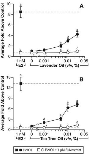 Figure 7. In vitro estrogenic activity of lavender oil and tea tree oil in reporter gene assays. MCF-7 cells were transiently transfected with the estrogen-inducible 3x-ERE-luciferase reporter plasmid and treated with increasing concentrations of either lavender oil or tea tree oil for 18 hours in the presence and absence of fulvestrant, an ER antagonist. Estradiol treatment (1 nM) was included as a positive control. Data are plotted as fold-luciferase activity over vehicle control. (Modified from Henley, D.V., Lipson, N., Korach, K.S., and Bloch, C.A., NEJM, 356, 481, 2007).