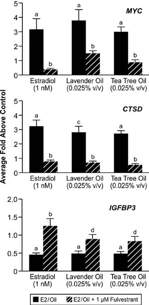 Figure 8. In vitro effects of lavender oil and tea tree oil on the expression of estrogen-regulated endogenous genes. MCF-7 cells were treated with 1 nM estradiol, 0.025% lavender oil, or 0.025% tea tree oil in the presence or absence of fulvestrant and real-time PCR was performed to measure changes in the expression of the estrogen-inducible genes MYC, IGFBP3, and CTSD. Data shown are normalized and relative to a vehicle control. (Modified from Henley, D.V., Lipson, N., Korach, K.S., and Bloch, C.A., NEJM, 356, 481, 2007).