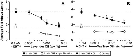 Figure 9. In vitro antiandrogenic activity of lavender oil and tea tree oil in reporter gene assays. MDA-kb2 cells stably transfected with the MMTV-luciferase reporter plasmid were treated for 24 hours with increasing concentrations of lavender oil or tea tree oil in the presence or absence of 0.1 nM dihydrotestosterone (DHT). The androgen receptor antagonist flutamide (1 µM) was included as a control antagonist for the androgen receptor. Luciferase activity was measured and data plotted as the average fold above control. (Modified from Henley, D.V., Lipson, N., Korach, K.S., and Bloch, C.A., NEJM, 356, 483, 2007).