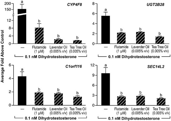 Figure 10. In vitro effects of lavender oil and tea tree oil on androgen-stimulated endogenous gene expression. MDA-kb2 cells were treated with 0.1 µM dihydrotestosterone for 24 hours in the presence or absence of 0.0005% lavender oil, 0.0005% tea tree oil, or 1 ?M flutamide and real-time PCR was performed to measure changes in the expression of androgen-inducible genes. Data shown are normalized and relative to a vehicle control. (Modified from Henley, D.V., Lipson, N., Korach, K.S., and Bloch, C.A., NEJM, 356, 483, 2007).