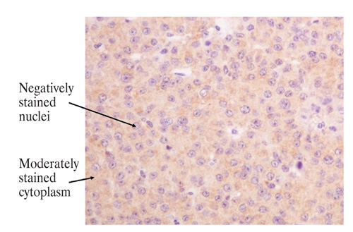Figure 3. Results for nuclear p21 immunostaining on a pituitary tumour. ACTH-secreting adenoma without cytoplasmic staining (magnification x 400).