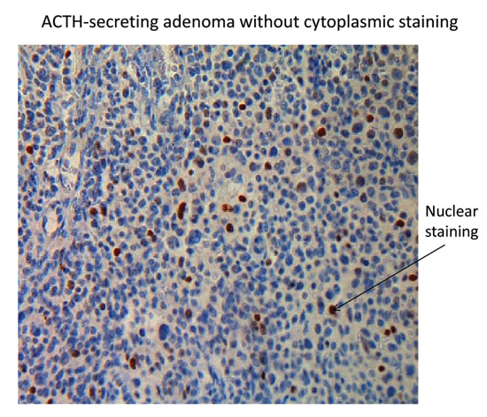 In order to compare the same tissue type, the ACTH-secreting adenomas were compared to carcinomas secreting ACTH: β-galactosidase staining was found to be higher in the carcinomas at borderline statistical significance (P=0.06). It is of note that one of the cases had received irradiation before the operation.