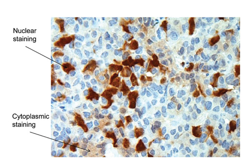 Figure 4B. Examples of nuclear and cytoplasmic p16 immunostaining in pituitary tumours. Non functioning pituitary adenoma (magnification x 1000). Nuclear staining: 2.9% strong + moderate. Cytoplasmic staining score: 6.