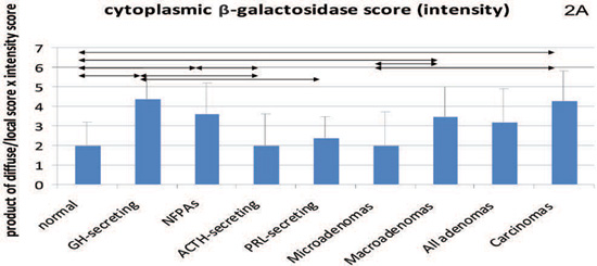 The staining for β-galactosidase was cytoplasmic alone (Figures 1a to 1d). In terms of individual comparisons, both GH-secreting and NFPAs as well as the macroadenoma and carcinoma group showed significantly higher β-galactosidase staining compared to the normal pituitary (Table 1, Figure 2). Furthermore, β-galactosidase staining was statistically higher in carcinomas and macroadenomas compared to either microadenomas or normal tissue. It should be noted that the only two cases of pituitary carcinoma with β-galactosidase staining score 6 had previously received external radiotherapy. However, when these two cases were excluded, the carcinomas still did not differ from the adenomas alone.