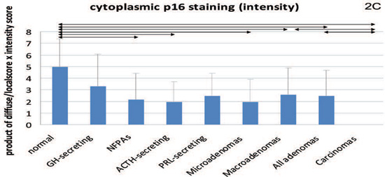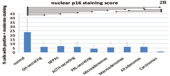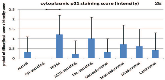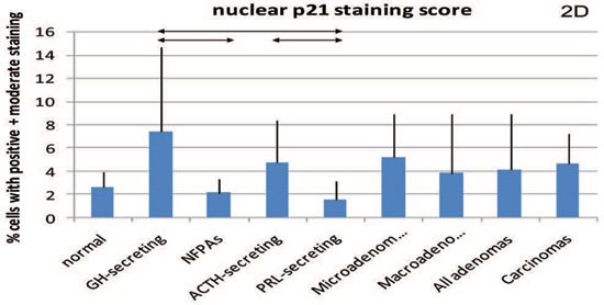 Figure 2. Cytoplasmic staining for β-galactosidase (2A) and both nuclear and cytoplasmic (intensity score) staining for p16 (2B and 2C, respectively) and p21 (2D and 2E, respectively). Mean values and standard deviation were used for a better visual presentation of the results. The statistically significant differences are depicted with lines which connect the groups being compared. NFPA: non functioning pituitary adenomas.