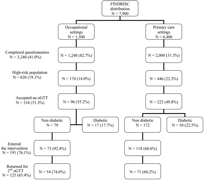 Figure 1. Flowchart of the various phases of the project, with number of FINDRISC questionnaires distribution, recruitment of persons at the occupational and primary-care setting and follow-up interventions.
