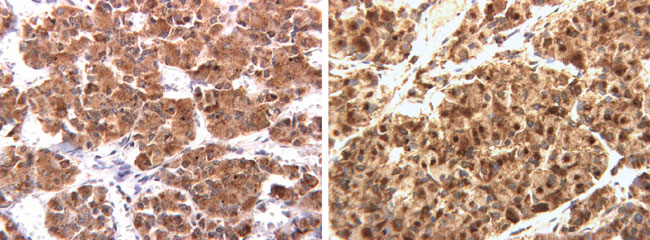 More than 90% of adenohypophysial cells were conclusively immunopositive for VEGF in every case. VEGF immunoreactivity was present in all of the specimens and there was no major difference between the pituitaries of pregnant or post-partum women and those of non-pregnant controls. Staining was limited to the cytoplasm. In comparison to those age-matched controls, no differences were noted in the intensity or frequency of immunostaining. Endothelial cells in the sections stained weakly with the VEGF antibody. The specificity of the antibody was confirmed by absent staining in the negative controls and successful absorption of the antibody with VEGF peptide which eliminated staining.