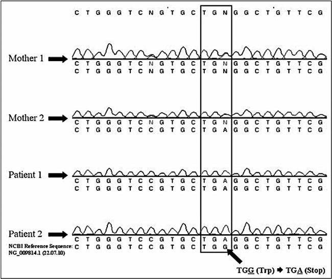 Figure 1. Identification of a novel c.315G>A; p.W105X nonsense mutation in patients 1 and 2 and their mothers. Chromatograms for other individuals tested in this study are not shown. The partial genomic sequence of the NR0B1 (DAX1) gene shows a p.W105X mutation at codon 105 by G to A substitution at nucleotide position 315. DNA sequences were compared to the NCBI Reference Sequence NG_009814.1 (22.07.2010).
