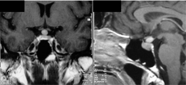 Figure 1. On the left, coronal T1-weighted, contrast-enhanced MR imaging showing a rounded mass located at the level of the pituitary stalk, over the pituitary gland, that appears intact; on the right, sagittal T1-weighted, contrast-enhanced MR imaging confirming the presence of a round mass located at the level of the pituitary stalk, over the pituitary gland, which in this plane seems enlarged in volume.