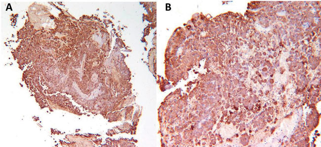 Figure 2. A: Intrapituitary microadenoma: adenomatous cells with positive immunochemistry for ACTH (4×); B: Adenoma attached to the stalk: adenomatous cells with positive immunostaining for ACTH (10×).