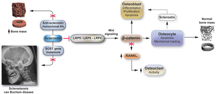 Figure 1. Sclerostin: From genes to antibodies. After its secretion from osteocytes, sclerostin binds to the LRP5/6/4 proteins in the cellular membrane in an autocrine and/or paracrine manner, inhibiting activation of Wnt signaling which regulates differentiation, proliferation and apoptosis of osteoblasts and osteocytes. Sequestration of beta-catenin also leads to activation of osteoclastogenesis. Inactivation of sclerostin either by mutations of the SOST gene or by anti-sclerostin antibodies leads to increased bone formation.