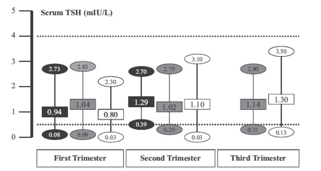 The recent American Thyroid Association (ATA) guideline recommends that in the absence of local reference values and after taking into account the importance of potential variations between the technical methods of measurement, the upper normal value for TSH in pregnant women should be 2.5 mUI/mL in the first trimester and 3.0 mUI/mL in the second and third trimesters. This value of 2.5 mUI/mL was chosen not only because it is close to the 97.5 percentile but also because higher values are associated with higher fetal morbidity.5,17 Figure 1 illustrates the downward shift of the TSH reference range according to the trimesters of pregnancy on the basis of data from three relevant publications.