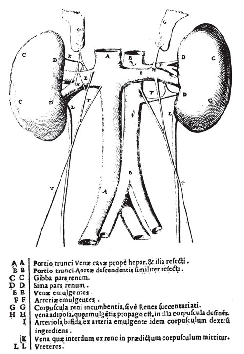 Bartolomeo Eustachio (or Bartholomeus Eustachius), a famous Italian anatomist who flourished in 16th century Rome, was the first to recognize the adrenal gland as a distinct anatomical entity. His treatise titled “Opuscula Anatomica” and published in Venice in 1564 contains the first description of the adrenal glands, which he labeled “glandulae quae renibus incumbent” (glands lying on the kidney).5 He defines the adrenals as glands “diligently overlooked by other anatomists”, that are capped on the upper kidney surface resembling a kidney in shape but sometimes bigger in size: “Both kidneys are capped on the extremity towards the cava by a gland. Both are connected with a fold of the peritoneum in such a way that one, if he is not very attentive, does really overlook them, as if they were not present. Their shape resembles that of the kidneys...sometimes one is bigger, sometimes another...early anatomists and those who write ample treatises on this art in our days failed to detect them”.6,7 Assisted by Pier Matteo Pini, an artist relative, Eustachio prepared an excellent series of copperplate engravings of anatomical illustrations. The series included the first depiction of the adrenal glands (Figure 1) and was meant to accompany a medical treatise, left however uncompleted when Eustachio died in 1574. The engravings passed through Pini and his heirs into the Vatican Library’s possession where they remained unprinted until discovered by Giovanni Maria Lancisi at the beginning of the 18th century. Lancisi, personal physician to Pope Clement XI, published the entire series of 47 splendid plates under the title: “Tabulae Anatomicae Bartholomei Eustachi quas a tenebris tandem vindicatas” (Anatomical Illustrations of Bartholomeo Eustachio rescued from obscurity) in 1714.