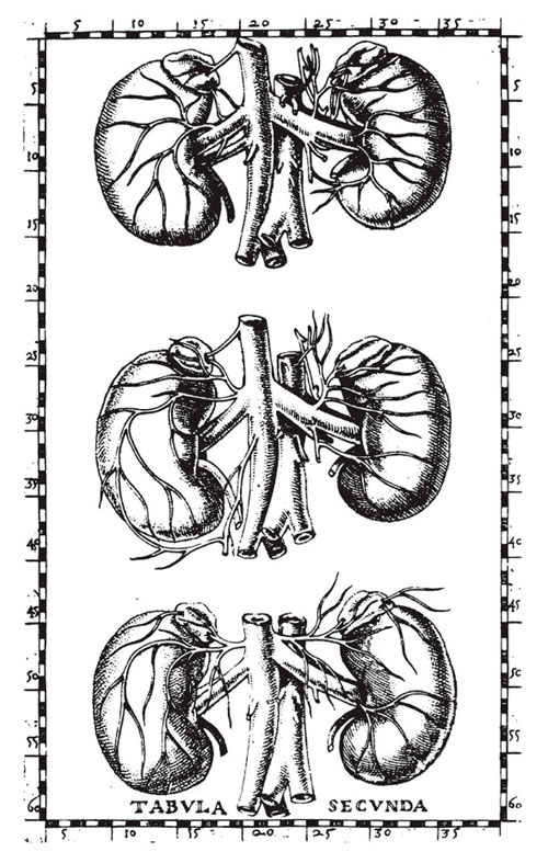 Figure 1. The first depiction of the adrenal glands available by Eustachius in 1552. (Reproduction from: Eustachi B, Lancisi GM. Tabulae anatomicae clarissimi viri Bartholomaei Eustachii quas e tenebris tandem vindicatas: Edition Medicina Rara; 1714. In public domain).