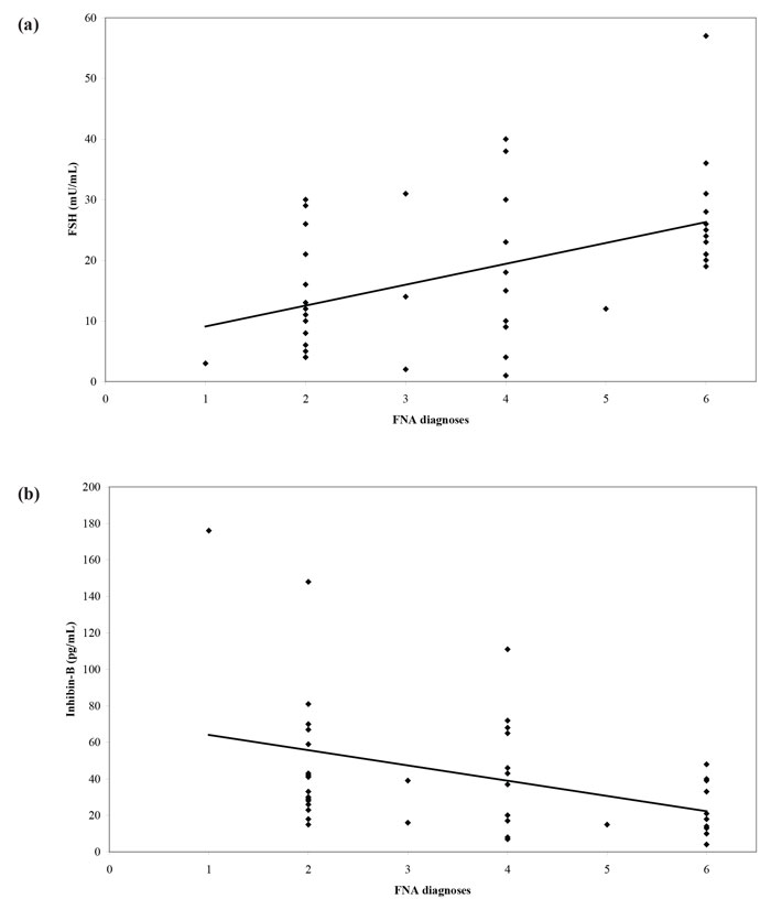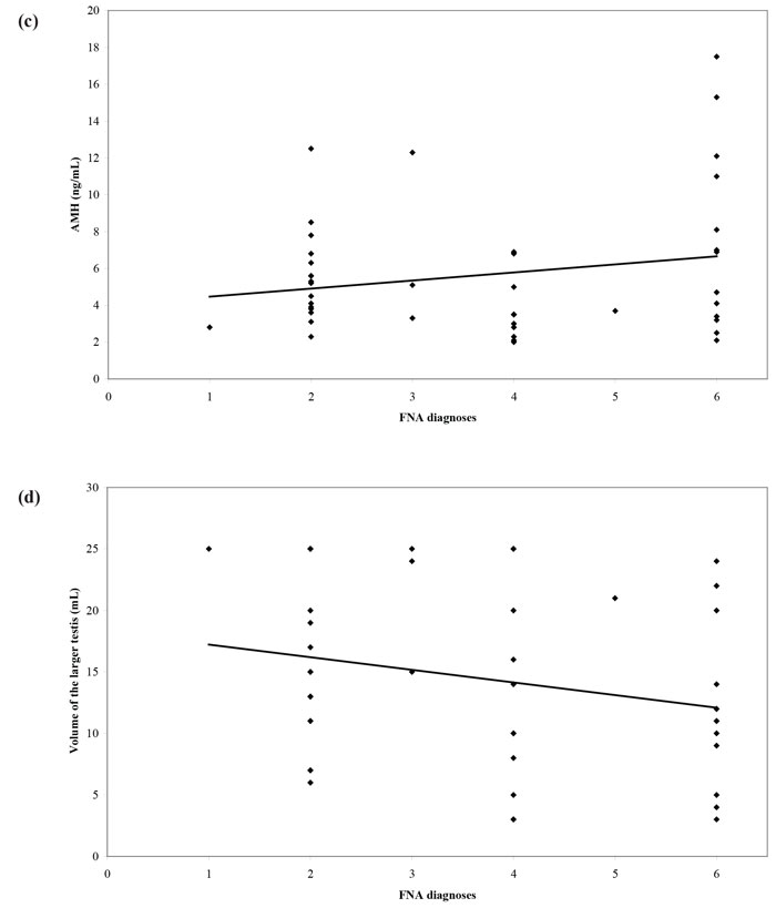 Figure 2. Scatter diagram and regression line of (a) FSH, (b) inhibin-B, (c) AMH concentrations and (d) volume of the larger testis versus FNA diagnoses (1: normal spermatogenesis, 2: hypospermatogenesis, 3: spermatogenesis arrest, incomplete, 4: spermatogenesisarrest, complete, 5: SCOS, incomplete, 6: SCOS, complete).31