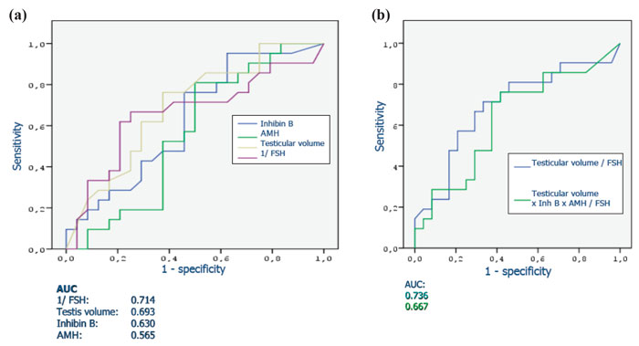 Figure 3. Receiver operating characteristic (ROC) curves of (a) FSH, testicular volume, inhibin B, AMH and (b) combinations of parameters, for sperm retrieval in testicular FNA.