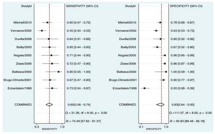Figure 4. Sensitivity and specificity of serum inhibin B for the prediction of the presence of spermatozoa in patients with non-obstuctive azoospermia.32 StudyId refers to each study’s first author and year of publication.