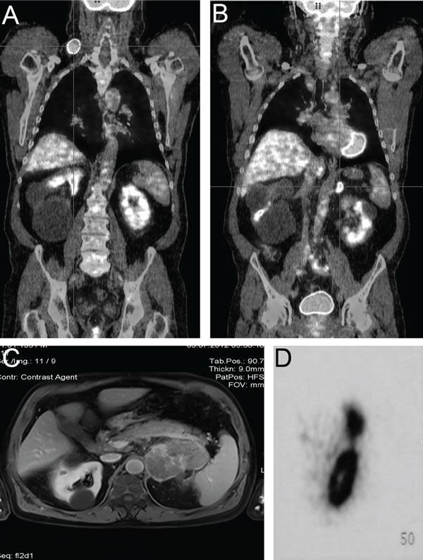 Figure 1. A) 18F-FDG PET/CT: significant tracer uptake in the right supraclavicular region (SUVmax: 10.0). B) Significant tracer uptake in the left adrenal grand (SUVmax: 4.7). C) MRI: large solid mass 88.5 min in diameter of the left adrenal gland, with inhomogeneous enhancement of the contrast agent and a low diffusion rate. D) OctreoScan: increased trace uptake in the left adrenal gland.