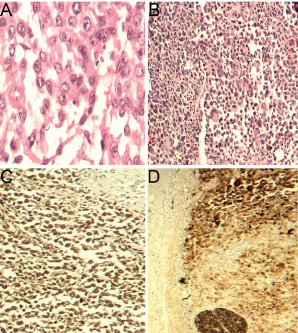 Figure 2. A) Adrenal tumor infiltration with microscopic features of malignant melanoma, in common H&E stain (1×400).B) Supraclavicular lymph node infiltration with highly anaplastic cells of malignant melanoma in H&E stain. C & D) Strong S-100 immunoreactivity of malignant melanoma cells infiltrating the adrenal gland (C) and the neck lymph nodes (D) (1×100).