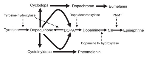 Figure 3. Biosynthetic pathway of melanins and catecholamines. Normal and malignant melanocytes express the enzyme tyrosine hydroxylase, a copper-containing enzyme that catalyzes the first steps of biosynthetic pathway of melanins from tyrosine. In melanoma tissue there is induction of tyrosine hydroxylase leading to production of DOPA. Activity of DOPA decarboxylase converts part of DOPA to 3,4-dihydroxyphenylethylamine (dopamine, DA) (for details refer to text). NE: Norepinephrine, PNMT: Phenylethanolamine N-Methyl Transferase. Dotted arrow indicates position of enzymatic action.