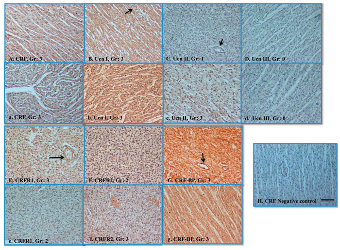 Figure 1. Immunohistochemistry for CRF neuropeptides and binding sites in heart tissues of human fetuses of different gestational trimesters, with or without diagnosed pathology. Grading (Gr) for the myocytes is shown. Some clearly positive vessels are also shown by arrows. A-G: fetuses with no diagnosed pathology from the second (B, C, E, F, G) and the third trimester (A, D). a-g: pathological fetuses from the first (c), second (a, b, e, f) and the third gestational trimester (d, g), diagnosed with various pathologies other than the heart. Gestational age was estimated by the mother’s LMP. Original magnification: X200. Scale bar = 100 μm. H: negative control (third trimester fetus).