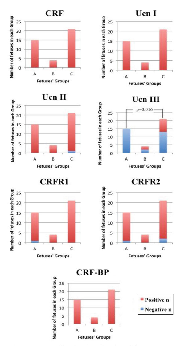 Figure 2. Immunohistochemical detection of CRF neuropeptides and binding sites: accumulated data showing fractions of positively (red) and negatively (blue) stained fetal heart tissues. X-axis: A: Group A (fetuses with no pathology), B: Group B (pathological fetuses with chromosomal abnormalities), C: Group C (pathological fetuses with congenital disorders). Y-axis: Number of fetuses in each Group. A statistical difference between Groups and respective p value are shown. n=number of fetuses.