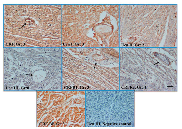 Figure 3. Immunohistochemistry for CRF neuropeptides and binding sites in the heart tissue of a fetus (female, 23 gestational weeks), diagnosed with heart pathology (presence of interventricular foramen, right ventricle hypertrophy and aortic translocation astride the interventricular septum). Grading (Gr) for the myocytes is shown. Some clearly positive vessels are also shown by arrows. Gestational age was estimated by the mother’s LMP. Original magnification: ×200. Scale bar: 100μm. Grade 3: >70% positive cells in the total number of cells of the specific cell-type counted per field. Grade 2: 40-70% positively stained cells. Grade 1: 10-40% positively stained cells. Grade 0: <10% positively stained cells.