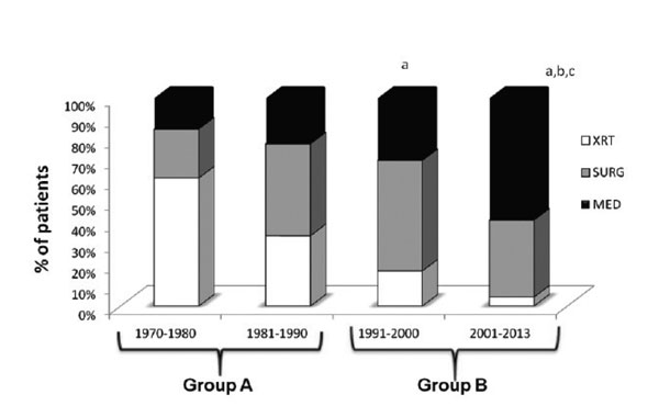 As shown in Figure 1, there was a significant change in the treatment modalities offered to our patients during the observation period. More group A than group B patients were submitted to radiotherapy (57.8% vs 16.8% patients, respectively, p <0.001); in contrast, more patients of group B were offered surgery (70.3% vs 42.1 group A, p <0.001) and/or medical treatment (70.3% vs 23.4% group A, p <0.001).