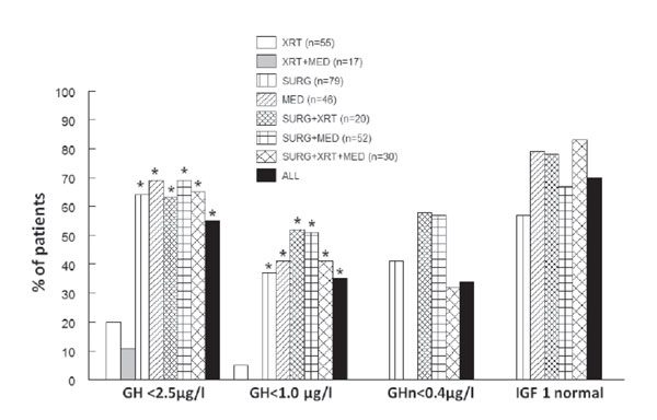 Irradiation as monotherapy or followed by medical treatment led to worse outcome compared to all other treatment groups (GH <2.5 μg/l in 20% and 11.7% of respectively, p <0.001 for all comparisons). During the observation period lasting 11.42 years (range 2.4-43.4 years) no report of radionecrosis, cerebrovascular disease or second tumor formation was noted in those patients submitted to irradiation. At the end of the observation period pituitary function tests following irradiation were available in 49 patients; when compared to 132 non-irradiated patients a higher incidence of pituitary deficiencies was noted: FSH/LH deficiency was found in 63.3% irradiated vs 12.4% non-irradiated patients (p <0.001), ACTH deficiency in 55.5% vs 7.5% (p <0.001) and TSH deficiency in 39.9% vs 6.8% (p <0.001).