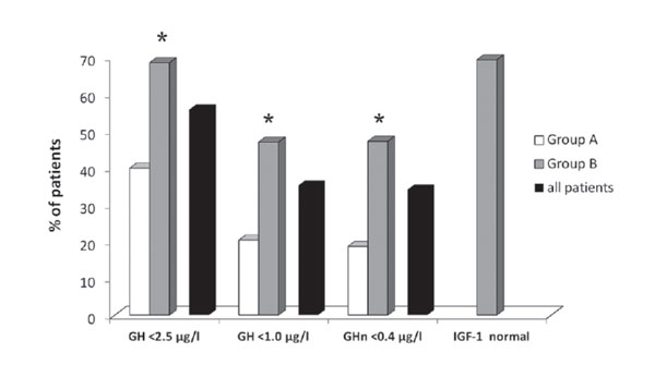 Figure 3. Overall disease outcome in the two time groups of acromegalic parients (*): denotes statistically significant difference from group A, p <0.05 GH <2.5, GH <0.1: random GH levels <2.5µg/L and <1.0µg/L respectively, GH <0.4: GH nadir levels in the glucose suppression test <0.4 µg/L.