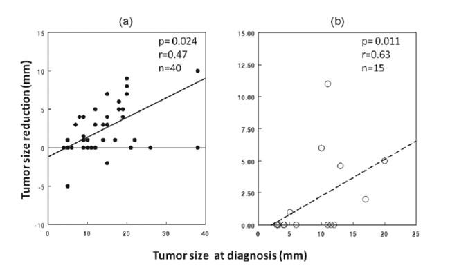 pre-treatment size in both groups (r=0.47, p=0.024 for first-line treatment and