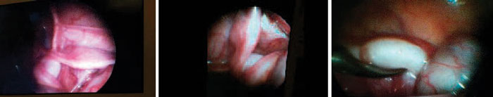 Laparoscopy revealed the presence of a rudimentary uterus at the midline and symmetrical fallopian tubes. The morphology of the gonadal structures was consistent with the testes being in a pseudo-ovarian position (i.e., the structures were attached to the fimbrial end of the fallopian tubes) (Figure 1). An exploratory laparotomy/excision was planned for the patient. Staged bilateral orchidopexy (Fowler-Stephens technique) was performed and the Müllerian structures were removed.