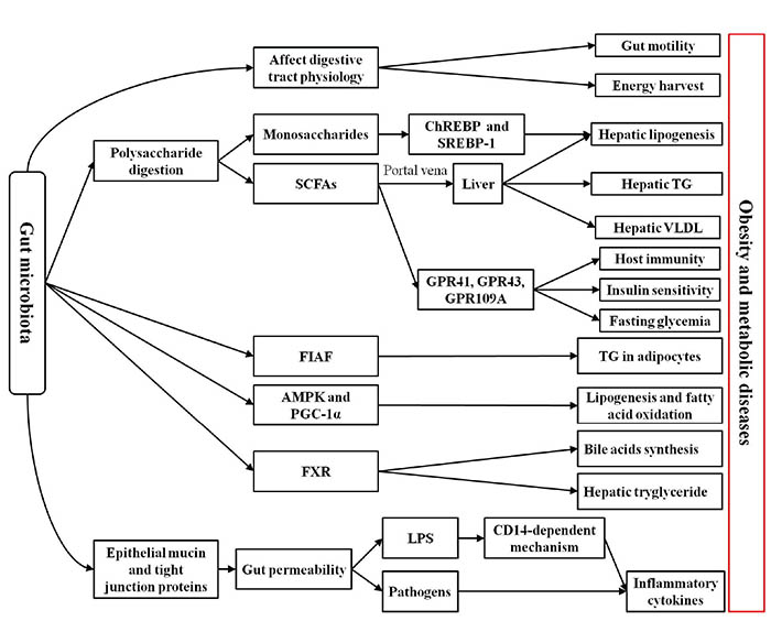 Figure 1. Possible mechanisms associated with the relationship between intestinal microbiota and obesity. Intestinal microbiota is thought to participate in molecular crosstalk with the host that modulates host physiology, metabolism, gut barriers, and inflammatory status. In particular, intestinal microbiota is involved in the physiology and motility of the digestive tract and in the digestion of polysaccharides, which could directly affect host energy availability. The monosaccharides produced by the intestinal microbiota from polysaccharides is likely to increase hepatic lipogenesis via the carbohydrate response element binding protein (ChREBP) and sterol response element-binding protein type 1 (SREBP-1). The short-chain fatty acids (SCFAs) produced by the intestinal microbiota from polysaccharides interact with G protein-coupled receptors (GPCRs; GPR41, GPR43, and GPR109A), which might be implicated in activating host immunity, regulating fasting glycemia, and affecting insulin sensitivity. Furthermore, SCFAs transported to the liver possibly increase production of hepatic lipogenesis, hepatic triglycerides (TG), and very low density lipoproteins (VLDL). The intestinal microbiota inhibits fasting-induced adipose factor (Fiaf) and adenosine monophosphate-activated protein kinase (AMPK) peroxisome proliferator-activated receptor γ coactivator 1α (PGC-1α), which may lead to increasing fat deposition. The intestinal microbiota also contributes to fat deposition through the regulation of the farnesoid X receptor (FXR), the bile acid receptor responsible for the regulation of bile acid synthesis and hepatic triglyceride accumulation. The gut microbiota also contributes to increasing intestinal permeability via decreasing the epithelial mucin and tight junction proteins, which could result in translocation of pathogens and lipopolysaccharides (LPS) across the intestinal wall. In addition, pathogens and LPS (via a CD14-dependent mechanism) may induce production of inflammatory cytokines.